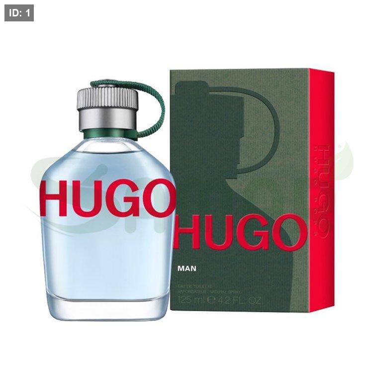 A 125ml bottle of HUGO Man eau de toilette . Woody Aromatic fragrance for men عطر رجالي هوجو بوس 125 مل برائحة التفاح الأخضر وبلسم التنوب