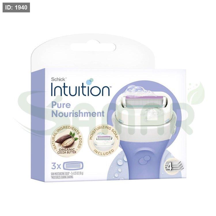 عبوة تحتوي على ثلاث شفرات حلاقة لسكِش إنتويشن، تتميز بتكنولوجيا الترطيب التي تسهل الحلاقة وتقلل من التهيج.