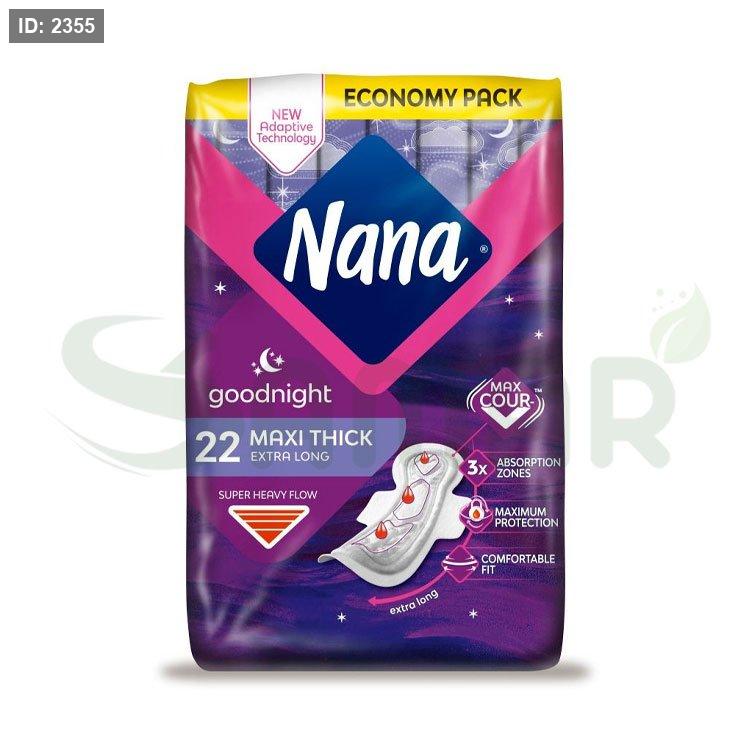 فوط نانا الليلية ماكسي السميكة بحجم طويل جدًا، عدد 22 قطعة، لحماية قوية أثناء الليل.