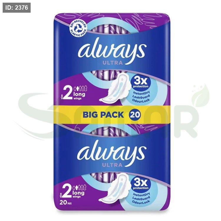 فوط ألترا الطويلة رقم 2، تحتوي على 20 قطعة، تمنح أمانًا وراحة لساعات طويلة.