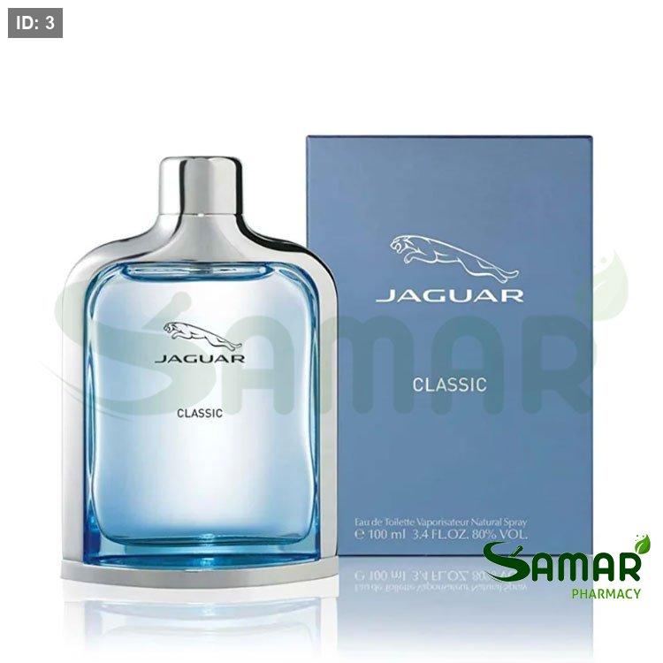A 100ml bottle of JAGUAR CLASSIC BLUE eau de toilette. A citrus ,fresh spicy, aromatic fragrance for menعطر رجالي جاكوار كلاسيك جذاب وأنيق بحجم 100 مل الممزوج بروائح الحمضيات، البرتقال، والريحان..