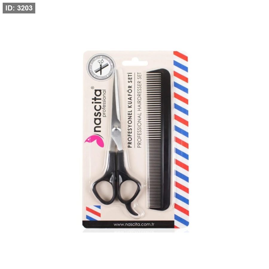احصلي على أدوات تصفيف احترافية مع طقم NASCITA 02 الذي يجمع بين مقص شعر عالي الجودة ومشط دقيق لمساعدتك في قص وتصفيف شعرك بسهولة ودقة في المنزل أو الصالون.