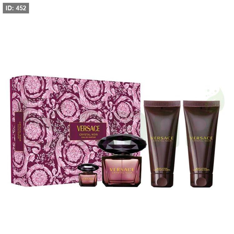 مجموعة فيرساتشي "كريستال نوار" - ماء عطر 4 قطع تجمع بين الفخامة والغموض، وهي مثالية للمرأة التي تبحث عن عطر مميز وجذاب.يبدأ العطر بنفحات من الفلفل الوردي والبرغموت، مما يضفي بداية حادة ومثيرة. ثم ينتقل إلى قلب غني بالأزهار مع الياسمين، زهرة البرتقال، والفريزيا، مما يضيف لمسة أنثوية رقيقة. أما القاعدة فتتميز بمكونات دافئة وغنية من المسك، خشب الصندل، والعنبر، مما يترك أثراً قوياً وجذاباً.